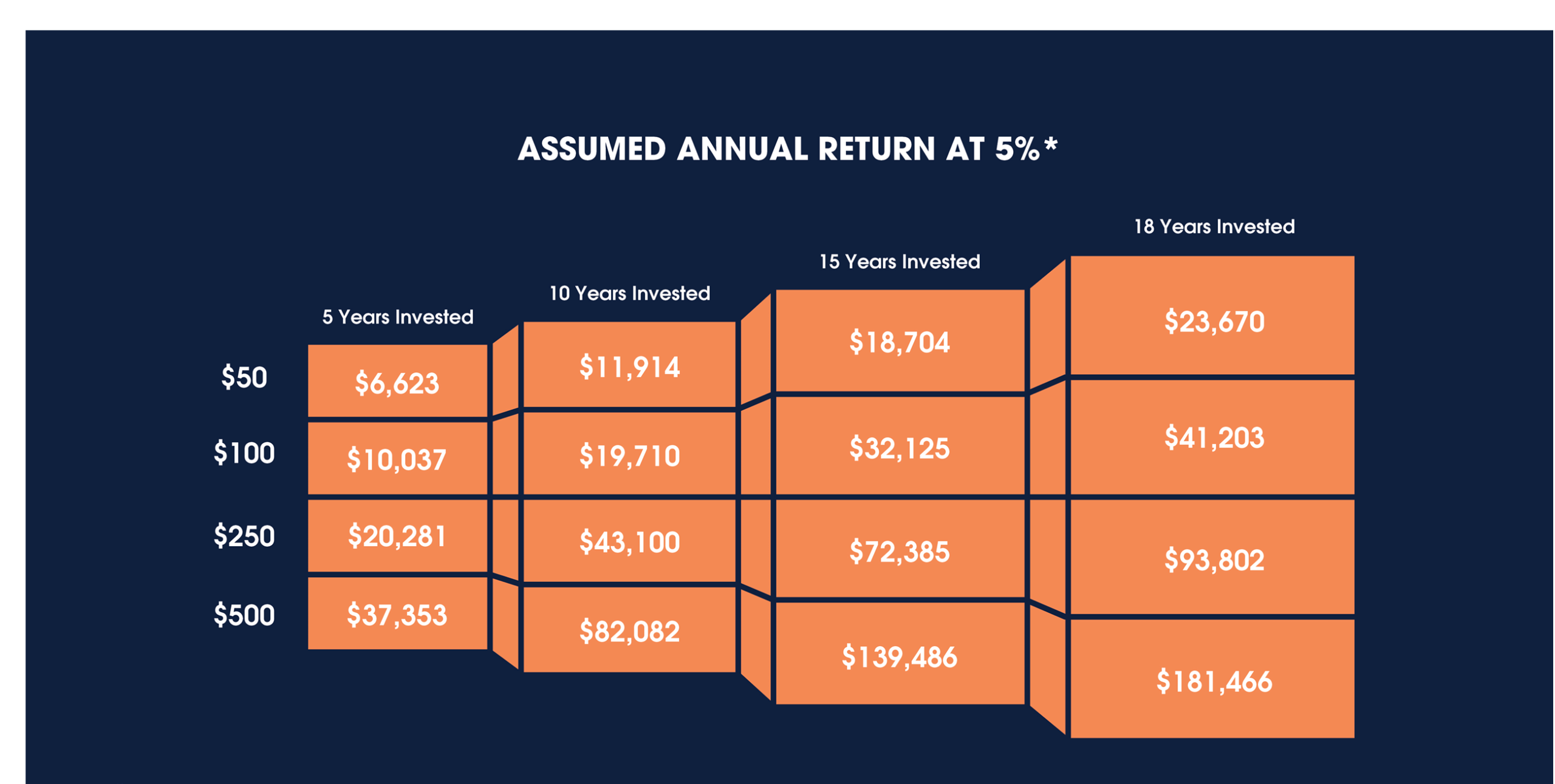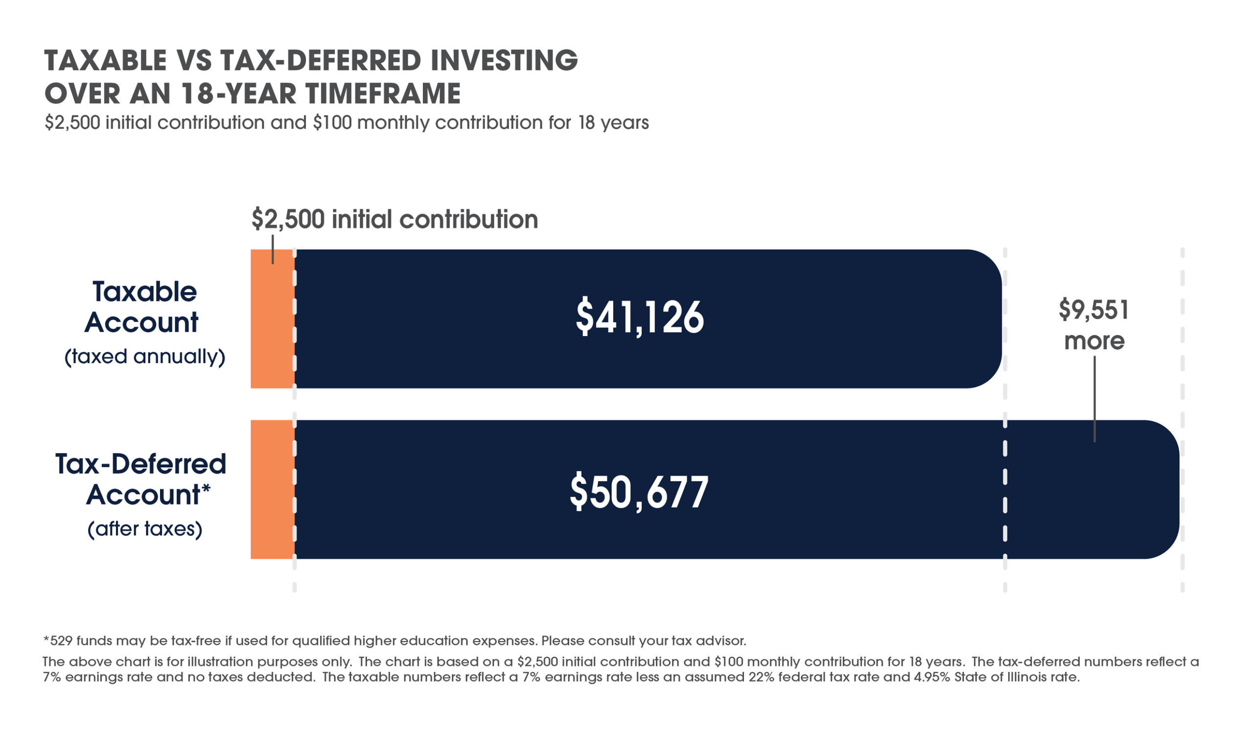 *This hypothetical example illustrates the accumulation potential with a $2,500 initial investment and a monthly contribution plan at a 5% projected average annual return. The above example is based on projections and does not reflect your actual investment in the Bright Start Direct-Sold College Savings Program or Bright Directions Advisor-Guided College Savings Program. If fees were included, the return would be lower. Your actual results may be more or less.